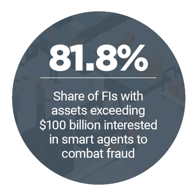 For instance, while 72.1 percent of commercial banks are interested in using smart agents to enhance their banking services, just 53 percent of credit unions are interested in doing the same. Meanwhile, 100 percent of FIs with more than $100 billion in assets are interested in adopting smart agents to support credit underwriting, and 89.5 percent of those with assets valued between $25 billion and $100 billion are interested in them to help in the fight against internal fraud.