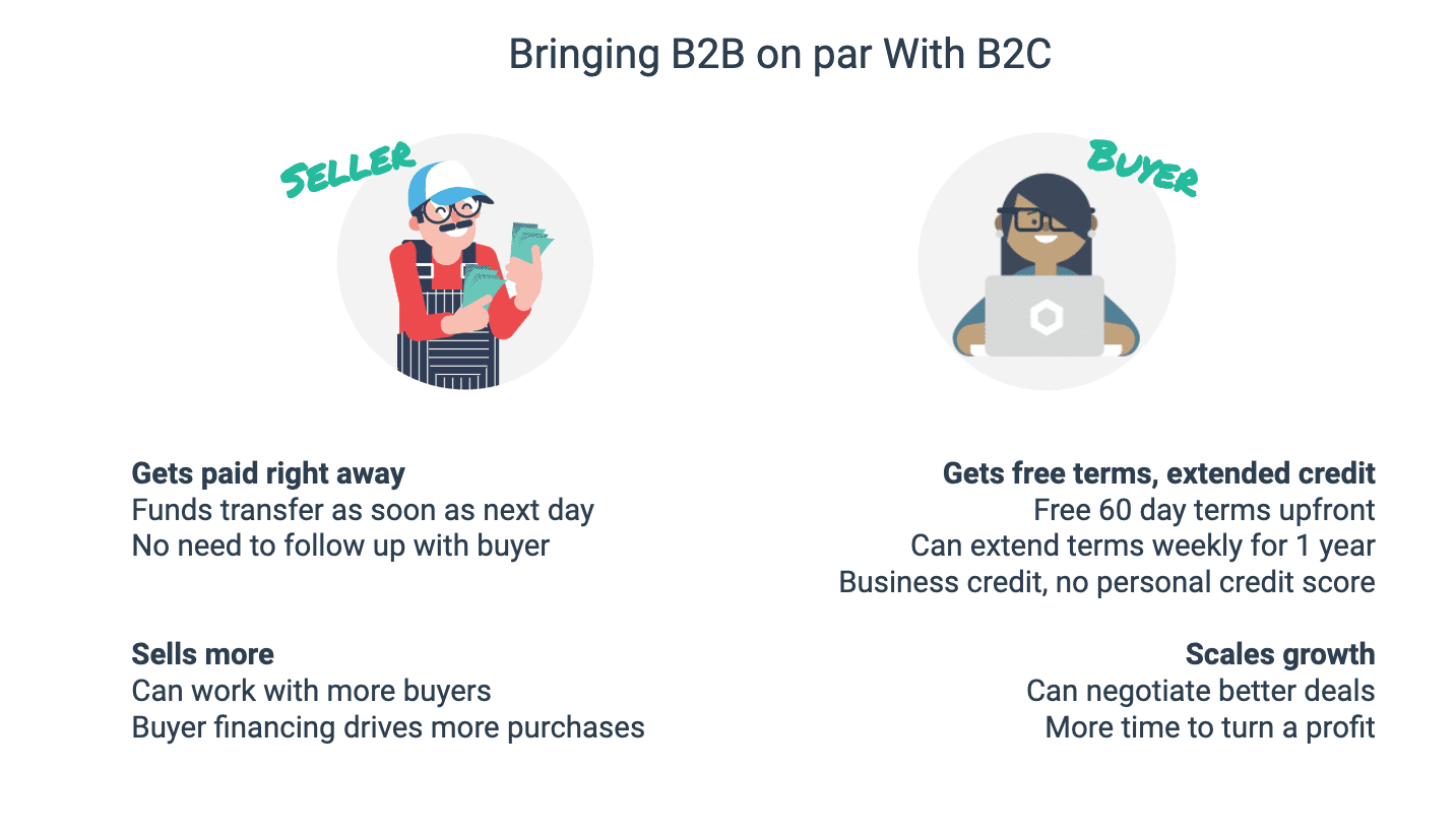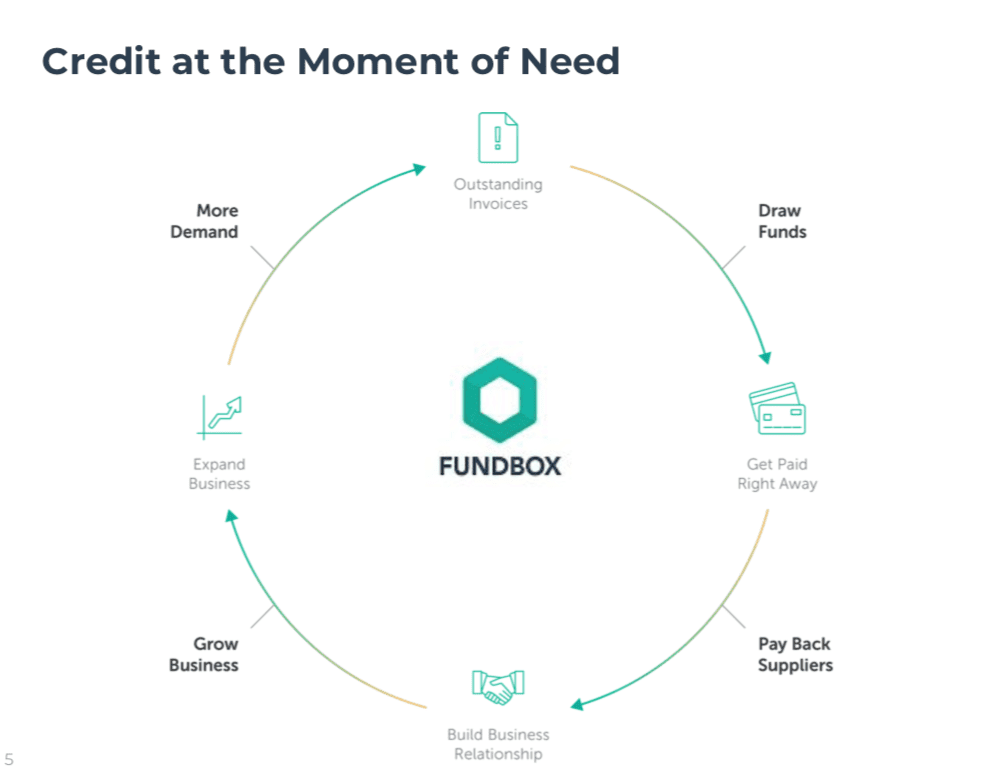 The sellers are paid through Fundbox, and financing is offered to the buyers as a line of credit or on a transaction-by-transaction basis via terms (i.e., to be repaid in 30, 60 or 90 days).