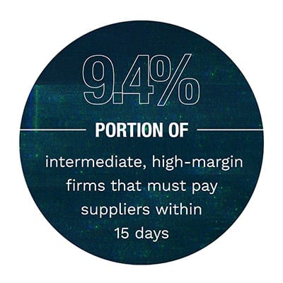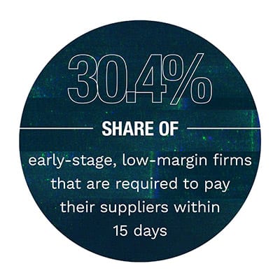 The existing trade credit systems offer crucial flexibility to established, high-margin companies, which helps them maintain cash flow and invest in their growth. High-margin businesses are more likely to be extended payment terms that exceed 30 days. For example, 11.7 percent of them report having to pay within 61 to 90 days. In contrast, just 3.1 percent of early-stage, low-margin firms are given such long payment windows. Rather, 30.4 percent of them must pay between one and 15 days, more than three times the proportion of intermediate, high-margin businesses.