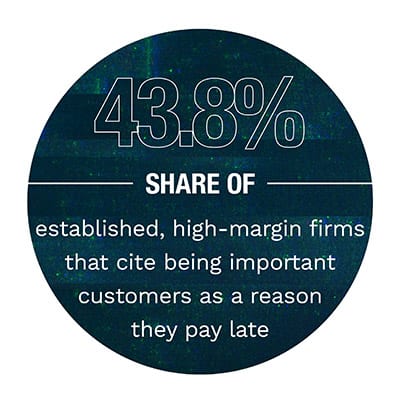 Under this informal system, late payments are common, but the reason cited by a significant portion of firms for paying late is notable: They expect their suppliers to accept late payments because they’re important customers. Not all businesses carry this attitude. While 45.9 percent of firms in business at least six years with high operating margins have this view, only 19.5 percent of firms with low margins do. In fact, they are much more likely to cite poor cash flow as a reason for paying late.