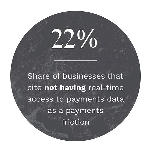y of the common payment pain points they face. Such frictions include difficulties when handling customers’ payment-related questions (cited by 28 percent) and challenges with managing multiple supplier relationships (24 percent). Firms also face stress when handling payments that take too long to receive, with 24 percent of businesses citing long payment wait times as payment-related friction. Real-time access to payment data may not make payments move faster, but it can give cash flow managers and other financial professionals more accurate insights into when they can expect their funds.