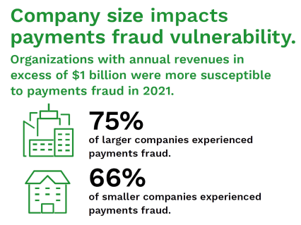 Overall, the share of organizations targeted for payments fraud actually declined in 2021, following a peak in 2019, when 81% reported being targeted. Of course, this does not mean that fraud is in decline, but simply that fewer companies were being targeted, and some forms of payments fraud grew during the pandemic. The share of organizations experiencing automated clearing house debit payments fraud increased to 37% in 2021 from 34% in 2020, while check fraud remained the top source, though unchanged from 2020, at 66%. The plateau in check fraud likely reflects the fact that companies shifting to digital payments solutions used fewer checks for B2B transactions.