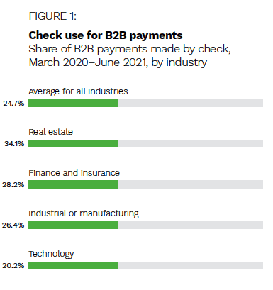 and receive payments, according to a recent PYMNTS study that found 40% of firms still rely on checks and postal mail for their B2B transactions. The real estate industry is especially dependent on manual methods: a June 2021 PYMNTS report found that paper checks made up 34% of real estate companies’ B2B payments.