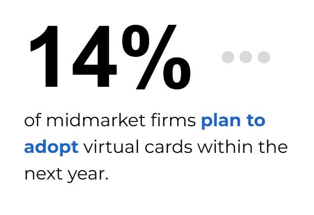 - Fourteen percent of mid-market firms — those with annual revenues between $50 million and $1 billion — plan to adopt virtual cards within the next year. This represents a remarkable 322% increase compared to current adoption levels, with particular interest in the media and technology (28%) and fleet and mobility (26%) sectors.