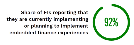 Ninety-two percent of FIs said they are currently implementing or planning to implement embedded finance experiences, according to PYMNTS’ research, with many different end goals. Fifty-two percent of FIs aim to innovate their payments processing, for example, while nearly 40% plan to improve their credit card offerings.