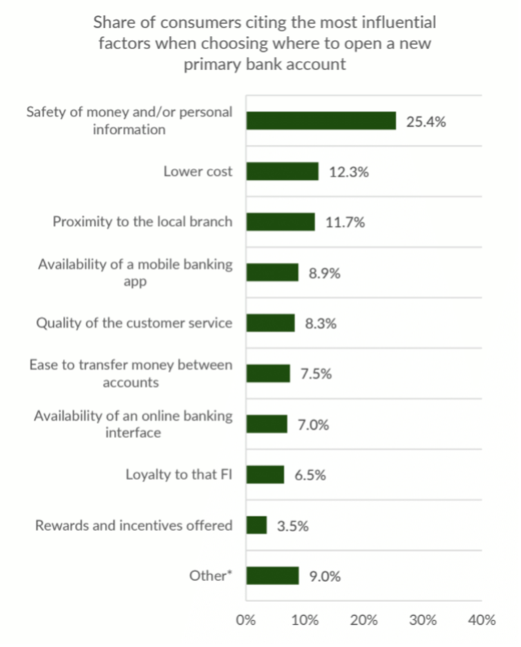 When it comest to the presence of local FIs, nearly 31% of consumers prefer to have their primary accounts at regional or local community banks, citing the convenience of proximity. As consumers prioritize cost over location and other factors, this preference may only partially offset a potential migration from local brands to FIs with a lower cost proposition.