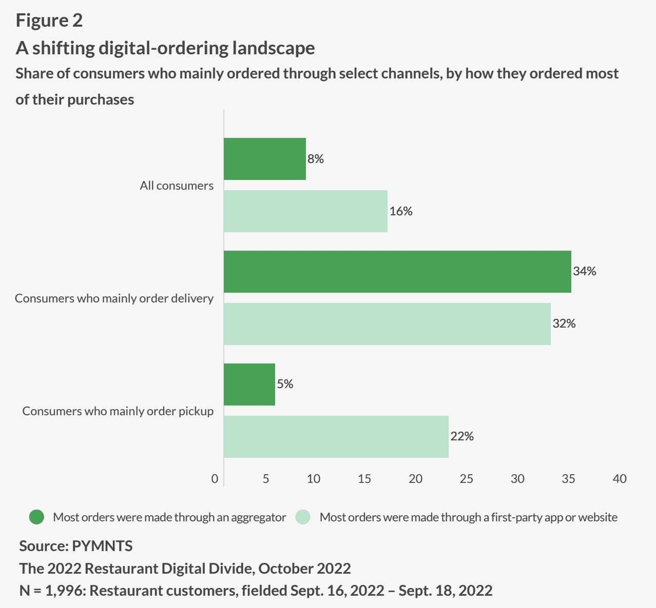 Research from this month’s edition of PYMNTS’ Restaurant Digital Divide report, “The 2022 Restaurant Digital Divide: Restaurant Apps And Websites In The Spotlight,” which draws from a census-balanced survey of nearly 2,000 U.S. consumers, finds that 16% of consumers primarily order food via restaurants’ direct ordering channels such as their website or their app. Meanwhile, only half that share (8%) stated that they mainly order food via third-party aggregator.