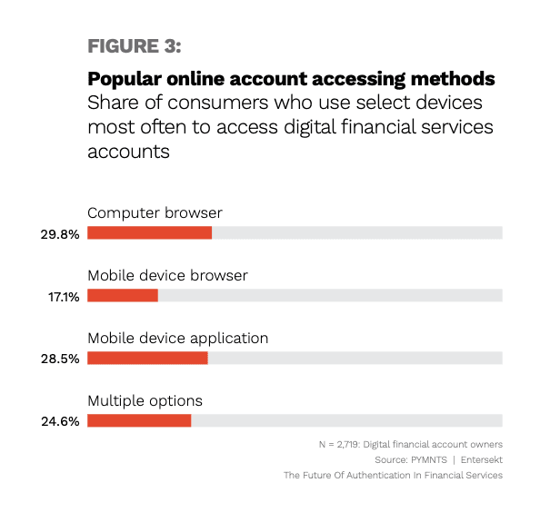 Thirty percent of consumers access their online accounts using computer browsers, and this remains the most regularly used way to view accounts, according to “The Future Of Authentication In Financial Services,” a PYMNTS and Entersekt collaboration.