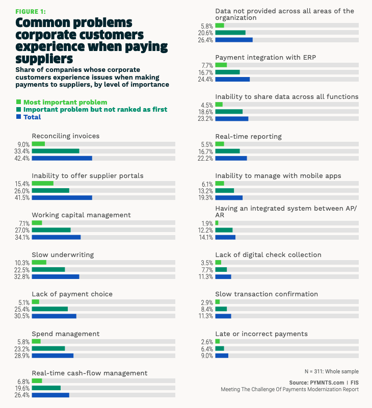 These problems are cited by 42%, 42%, 34% and 33%, respectively, of businesses, according to “Meeting the Challenge of Payments Modernization,” a PYMNTS and FIS collaboration based on a survey of 311 executives from leading FIs that manage assets in excess of $500 million.