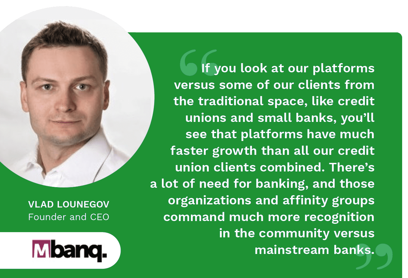 Ultimately, banks are brands, Lounegov said, but people care more about brands they engage with on social media or via mobile apps than FIs. Therefore, BaaS platforms for brands and organizations have driven the lion’s share of Mbanq’s growth and also represent a wider opportunity for expanding use cases, which include early access to wages or payday advances.