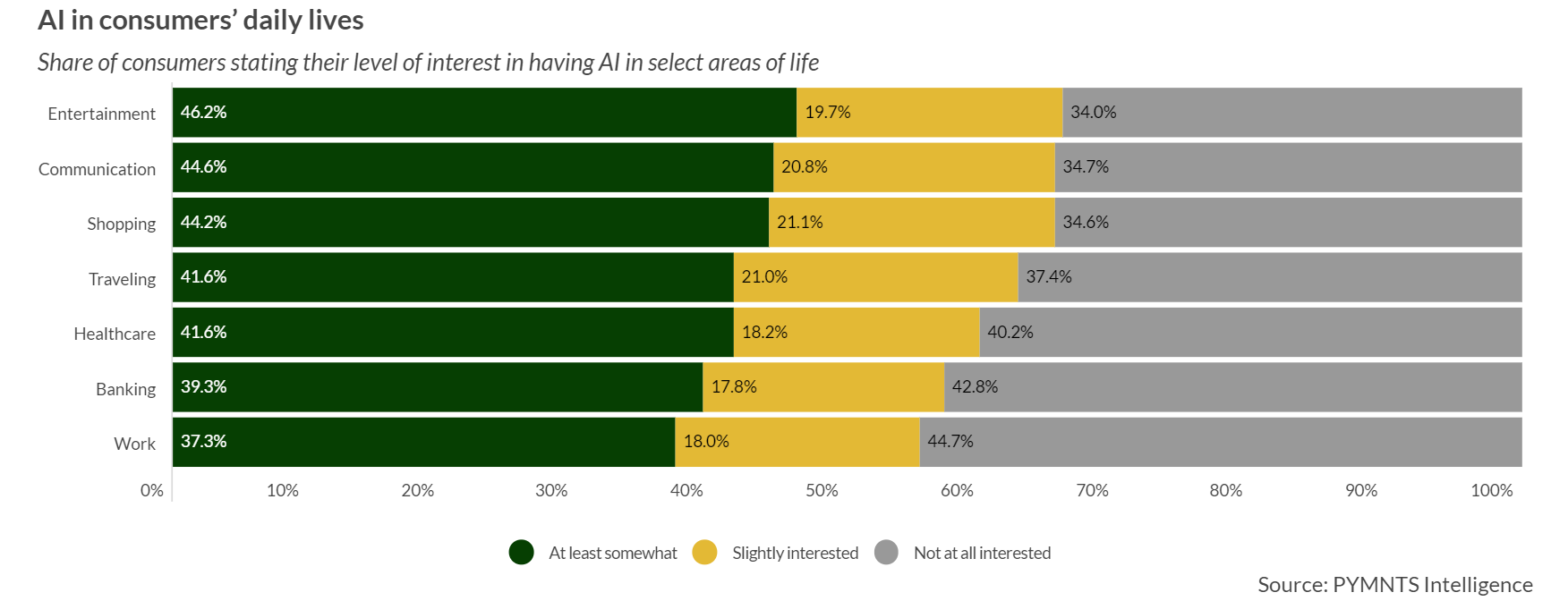 In fact, the “Consumer Interest in Artificial Intelligence” study found that only 39% of consumers expressed at least some interest in AI involvement in their banking activities, and this percentage dropped to 28% among baby boomers and seniors.