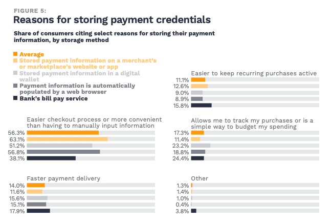 As the study notes, “56% of consumers opted to store their payment data because it provides an easier checkout process, given that it is more convenient than manually entering information. A higher share of respondents who use a merchant’s website or app to store credentials cited convenience as a reason, compared to those who use browsers or digital wallets.”