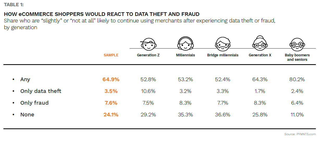 Digital fraud’s impact is not limited to stealing funds and data, as it can also have long-term ramifications for customer loyalty. Customers are likely to abandon eTailers entirely after experiencing data theft or fraud. In fact, 65% of consumers in a recent PYMNTS study said they would be “slightly” or “not at all” likely to continue using merchants after having their data stolen. Eighty percent of Baby boomers and seniors were the most likely to abandon merchants after a security incident. This willingness to switch merchants after security incidents may increase, as 48% of eCommerce shoppers said they were more worried about data security now than before the pandemic began. Thirty-six percent of consumers already base their choice of payment method on the likelihood of theft, and this number shows no sign of declining.