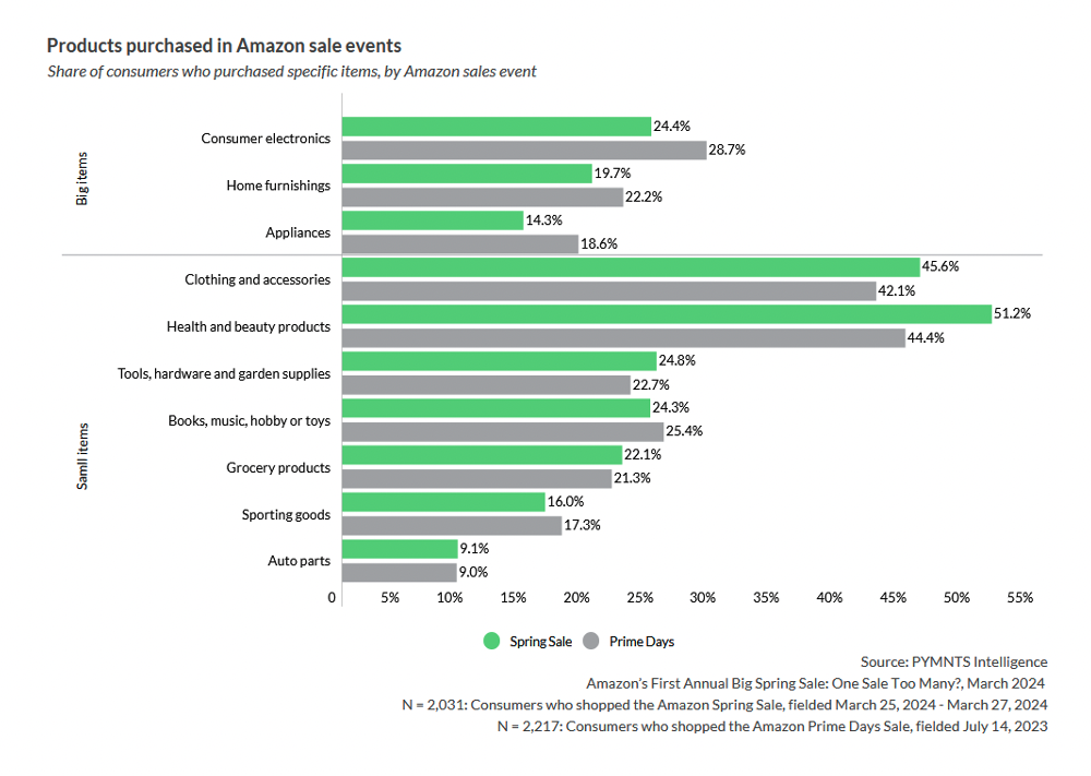 For many of those in the know, however, it was a reason to spend. On average, Amazon Big Spring Sale shoppers bought six items during the sale period, which is one item less than consumers typically pick up during Amazon Prime Day. Not only did shoppers buy fewer items, they bought far fewer big-ticket items such as home appliances, electronics and furniture. Instead, shoppers used the sale to stock up on day-to-day items like clothing, accessories, beauty and health products. Fifty-one percent bought health and beauty products, making that the highest-selling category for the five-day event.