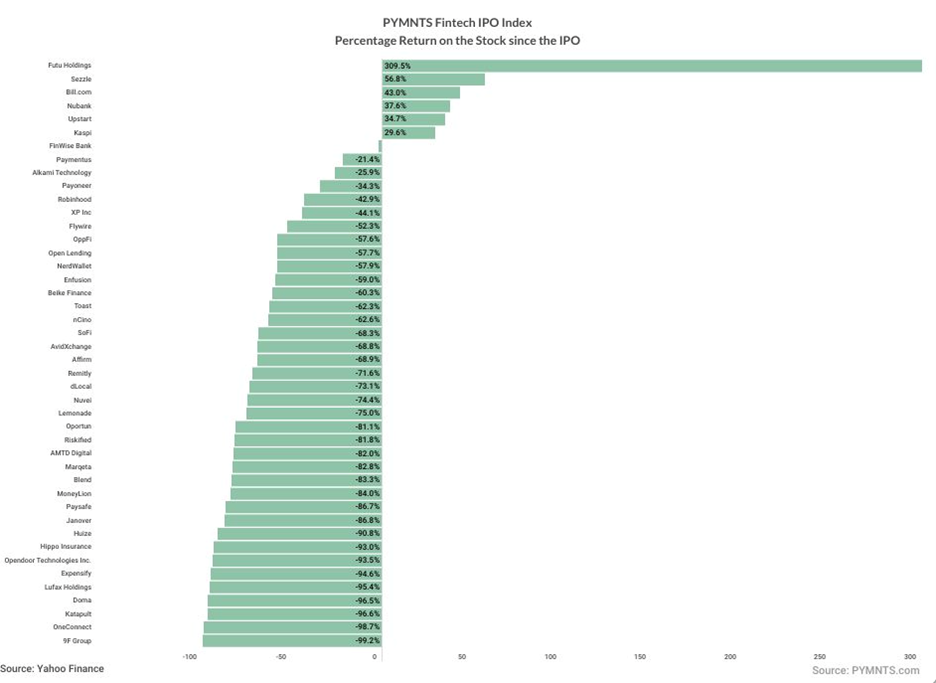 It was a relatively quiet week on Wall St. as FinTech news started to hit the slow part of the Q2 earnings season. A lot of the action took place overseas this week. Chinese FinTech Futu, which still tops the index with a 300-point percentage return since its IPO, led the way with solid earnings or new partnerships, as did nCino and Affirm. All in, the index lost a bit more than a percentage point.