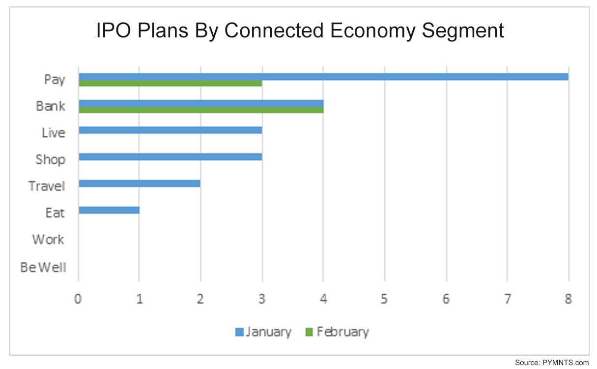 Drilling down, as PYMNTS has found, FinTechs and payments and commerce companies have seen their own fair share of public listings. Just two months into the year, planned IPOs announced by segment show 11 firms within payments, and eight within banking, to point out two of the more crowded spaces. The chart below shows how each of the PYMNTS connected economy sectors (How We Will Pay, How We Will Eat, etc.) fared for January and February. As shown, the payments sector jumped out to a torrid start in January, as did other sectors. Among the eight payments companies filing in January: Affirm, Poshmark and Petco.