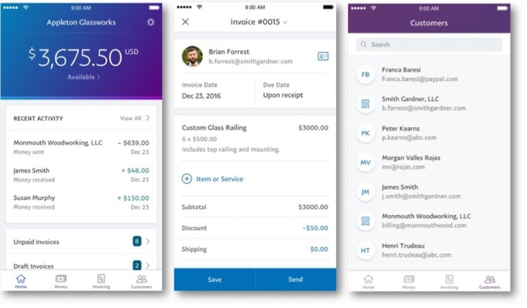 And so the app, as it stands today, comes ready to help — allowing customers to create, send and attach photos to invoices directly from their mobile phone; monitor sales activity; withdraw funds; issue refunds; send payment reminders; manage customer lists; import contacts and view customer histories.