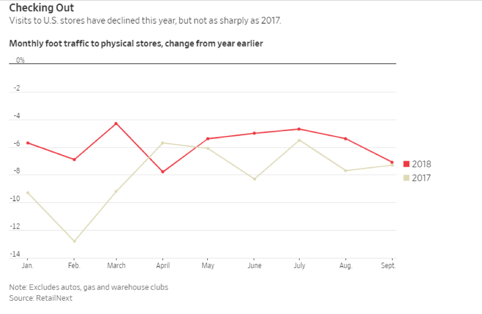 The Wall Street Journal reported yesterday that foot traffic in physical stores is down for the fifth straight year, but not quite as sharply as in years past — not just during holiday times, but all the time.