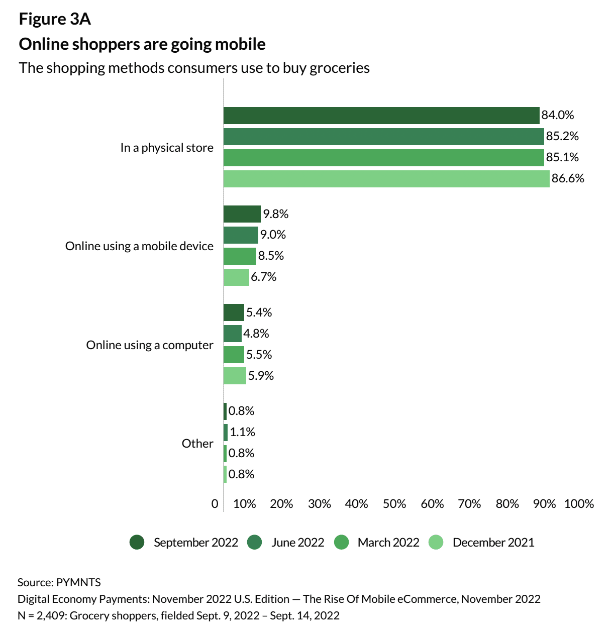 According to data from the latest edition of the Digital Economy Payments study, “Digital Economy Payments: The Rise Of Mobile eCommerce,” for which PYMNTS surveyed more than 2,700 U.S. consumers about their shopping habits, the share of grocery purchases consumers are making in stores is on the decline. The figure fell to 84% in Q3 2022, down one point from the quarter prior and three points from Q4 2021. Meanwhile, mobile shopping rose to 10%, up one point from the quarter prior and three points from Q4 2021.