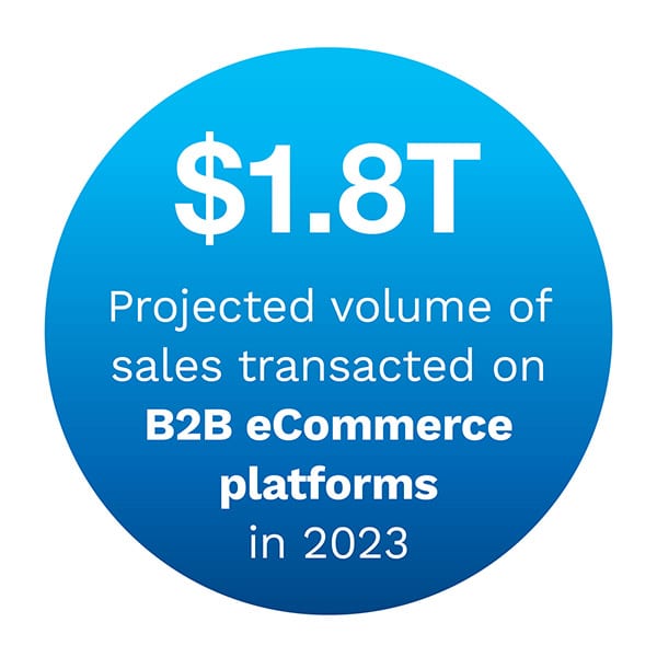 invoices and word-of-mouth business relationships have remained prevalent. However, this has been steadily changing in recent years with the rise of digital platforms and marketplaces. The volume of B2B business transacted through eCommerce marketplaces like Amazon Business and Alibaba is projected to grow to $1.8 trillion by 2023 and make up 17 percent of all B2B sales. Companies are also opening up their own eCommerce platforms, allowing business customers to search for and purchase goods and services through web and mobile sites.