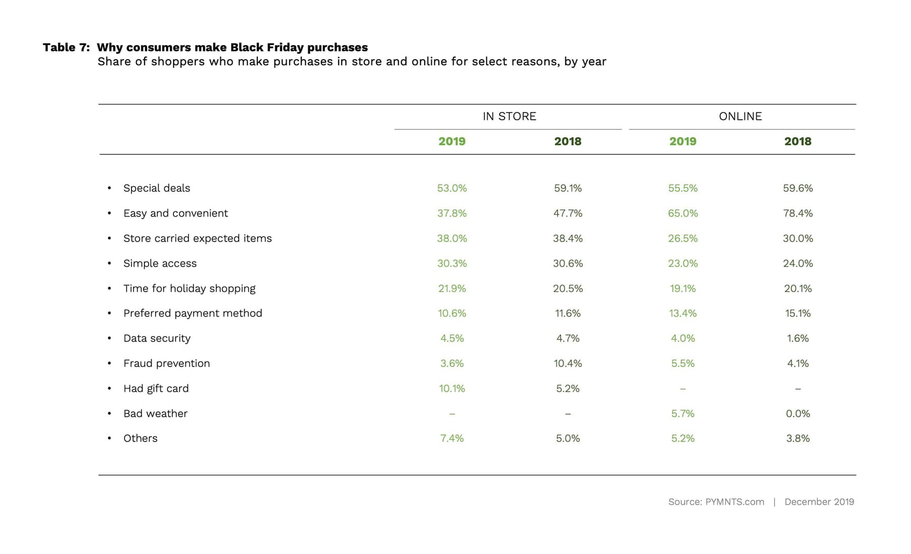 Not surprisingly, given Black Friday’s roots in physical retail, retailers have trained shoppers that Black Friday is “deal day” and to expect those big “doorbuster” savings in their stores. And that is what still drives many shoppers to the physical store on that day. This year, 53 percent of consumers who bought at least one item in-store said that they did it to get access to those special deals.