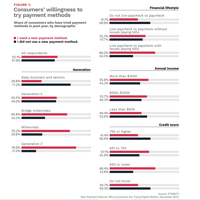 This at a time when new findings in the report “New Payment Options: Why Consumers are Trying Digital Wallets,” done in collaboration between PYMNTS and Nuvei found that 52% of consumers, overall, tried a new payment option last year.