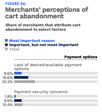 Among the reasons cited by merchants for those abandoned carts — and the lost sales: lack of desired/available payment options. Unexpected shipping costs also play a factor, according to the responses, and consumers also may pivot to competitors because they might have found cheaper products elsewhere.