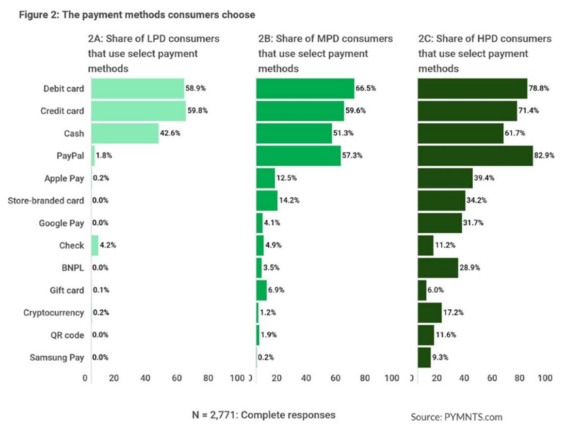 That preference cuts across all permutations of what we might call payments demographics — those consumers who show a broad or high range of payment diversification. These are the consumers who utilize at least three payment methods, with at least two of them classified as nontraditional methods, such as crypto.