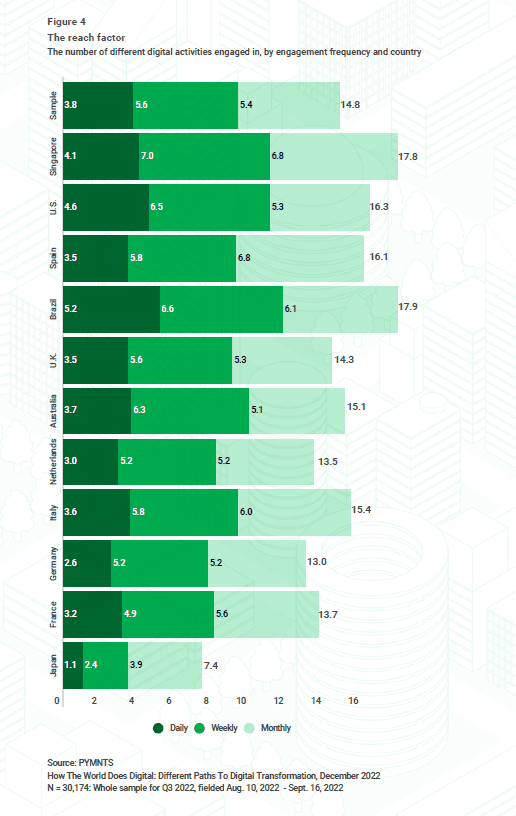 PYMNTS conducted a comprehensive survey of more than 30,000 consumers across 11 countries for its December ConnectedEconomy™ Index, “How the World Does Digital.” Concentrating on global digital transformation, the Index maps out how consumers worldwide integrate online tools, make transactions and participate in other activities via digital means on a regular basis.