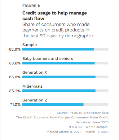 The chart below shows that a vast majority of younger consumers have been using credit to help with cash flow — and millennials, at more than 85%, top the list.