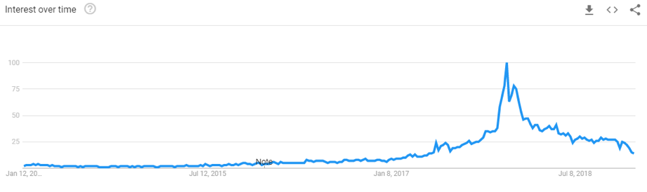 The hype machine has turned instead to “the blockchain,” as if it is a thing. It isn’t – as known by you longtime readers of my writings, and now maybe even by those who used to search on Google to get more scoop on it. Its interest, as measured by searches, appears to be going in a different direction than the PR hype machine might suggest.