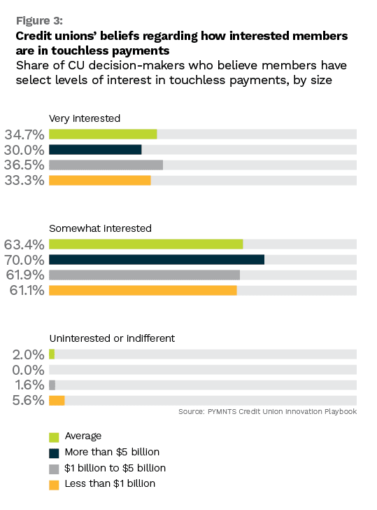 “Credit unions could lose their members if they do not begin investing in touchless payment innovations. Our research shows that 15 percent of all credit union members would be ‘very’ or ‘extremely’ likely to leave their current CUs to bank with competitors if those competitors were able to offer them touchless payments options,” per the Playbook. “We also found that 21 percent of members would be ‘somewhat’ likely to switch FIs for touchless payments.”
