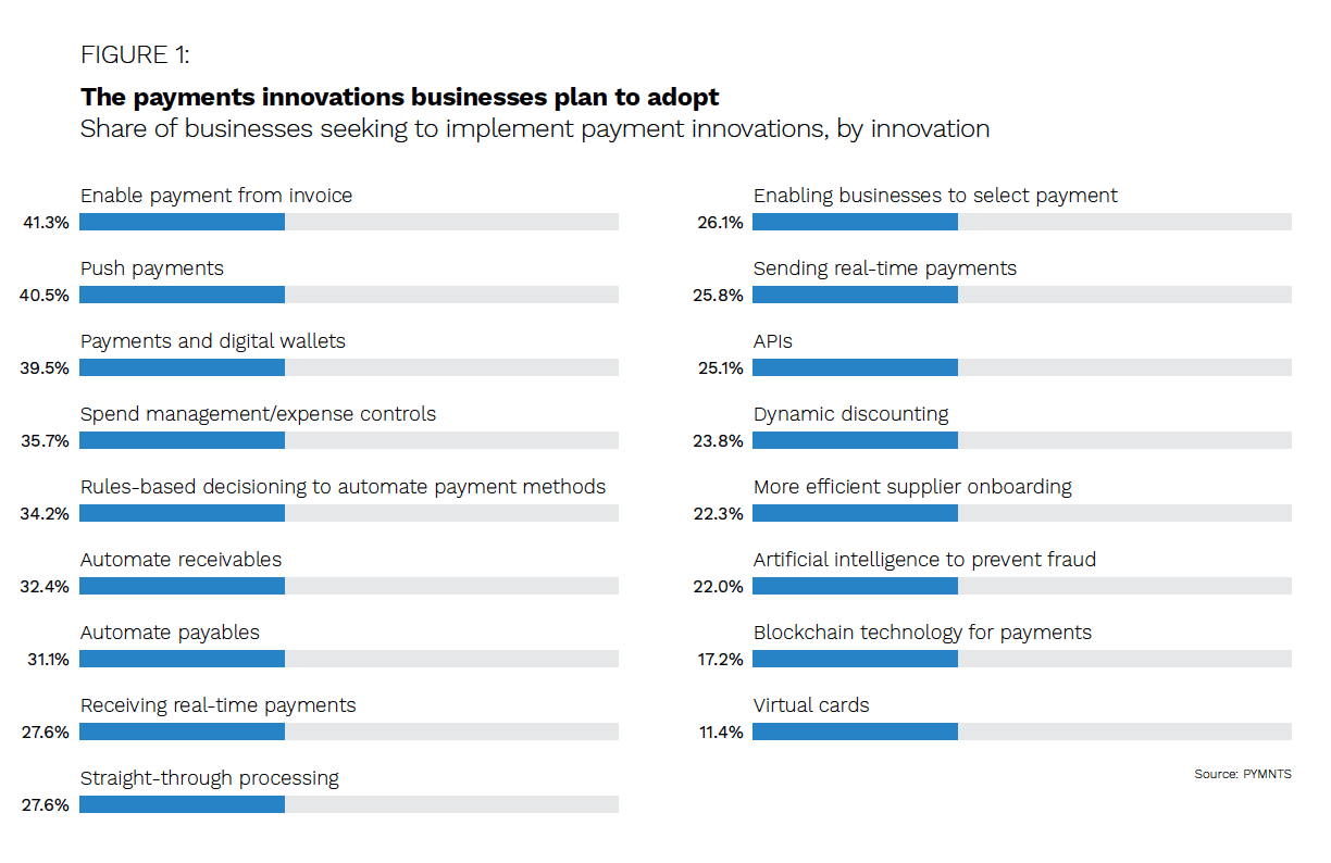 However, maintaining these relationships can be time-consuming or complicated, potentially straining businesses’ ability to quickly and effectively adapt their business models, launch new products or move to new markets. Streamlining their payments or other back-end processes to juggle these various relationships is therefore becoming a high priority for a growing number of companies. April 2021 PYMNTS data found that companies were seeking to innovate various parts of their payment operations, with 36% of businesses noting they want to implement new spend management or expense controls, for example.