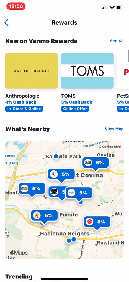If the shopper was using Venmo, the process would be slightly different. Because Venmo has the arrangement with Dosh instead of the retailers, the shopper would open Venmo and see a map of participating Dosh retailers, and would be served additional personalized offers based on location and purchase history. In this case, if the purchase was made with Venmo at Sephora, the cash-back would go right to Venmo, not the Dosh app.