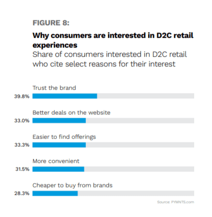 PYMNTS’ recent How We Shop: Measuring the Rapid Digital Shift study, done in conjunction with PayPal, found that a large share of U.S. consumers surveyed (37 percent) are interested in direct-to-consumer sales. The No. 1 reason cited involves loyalty to well-known brands. Some 40 percent of those interested in D2C said they’ve bought from and trusted the brands where they want to purchase directly. Another 33 believe D2C retailers have better deals on their websites, while 33 percent say it’s easier to see all of a brand’s offerings on one site:
