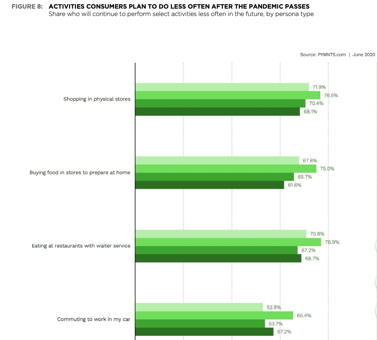 PYMNTS found that close to 77 percent of those shopping less in physical stores plan to do so at least “somewhat less often” than before, per the report. It added that “safety shifters are also the most likely to say they plan to buy ingredients to prepare at home [and] eat in restaurants with waiter service … less often than before — even after the pandemic has passed.”