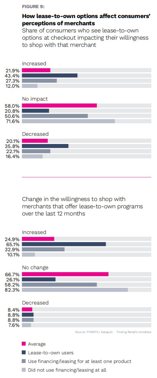 Providing lease-to-own options also affects consumer perceptions of merchants, as 22% of respondents said their willingness to shop was higher when merchants offered the plans, and 25% of consumers said their willingness to shop with these merchants had increased over the last 12 months.