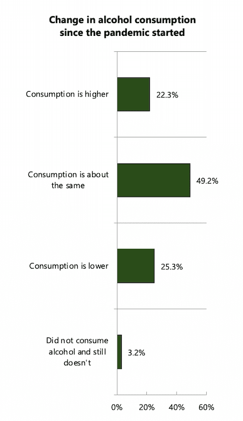 According to our survey of 1,994 U.S. adults, more people have actually decreased their alcohol consumption than increased their consumption — 25 percent of consumers are drinking less, compared to only 22 percent who are drinking more. Of course, this is not to say that fewer drinks are being consumed overall — reports that liquor sales have been up may indicate that the “consumption is higher” group may be adding more drinks per week than the “consumption is less” group is cutting out. (For example, if two people have cut out three drinks per week, and one person has added 10, more alcohol overall would still be consumed.) Meanwhile, the fact that one in four consumers has been cutting back on alcohol may give a little more insight into the rising popularity of mocktails and other premium, non-alcoholic drinks.