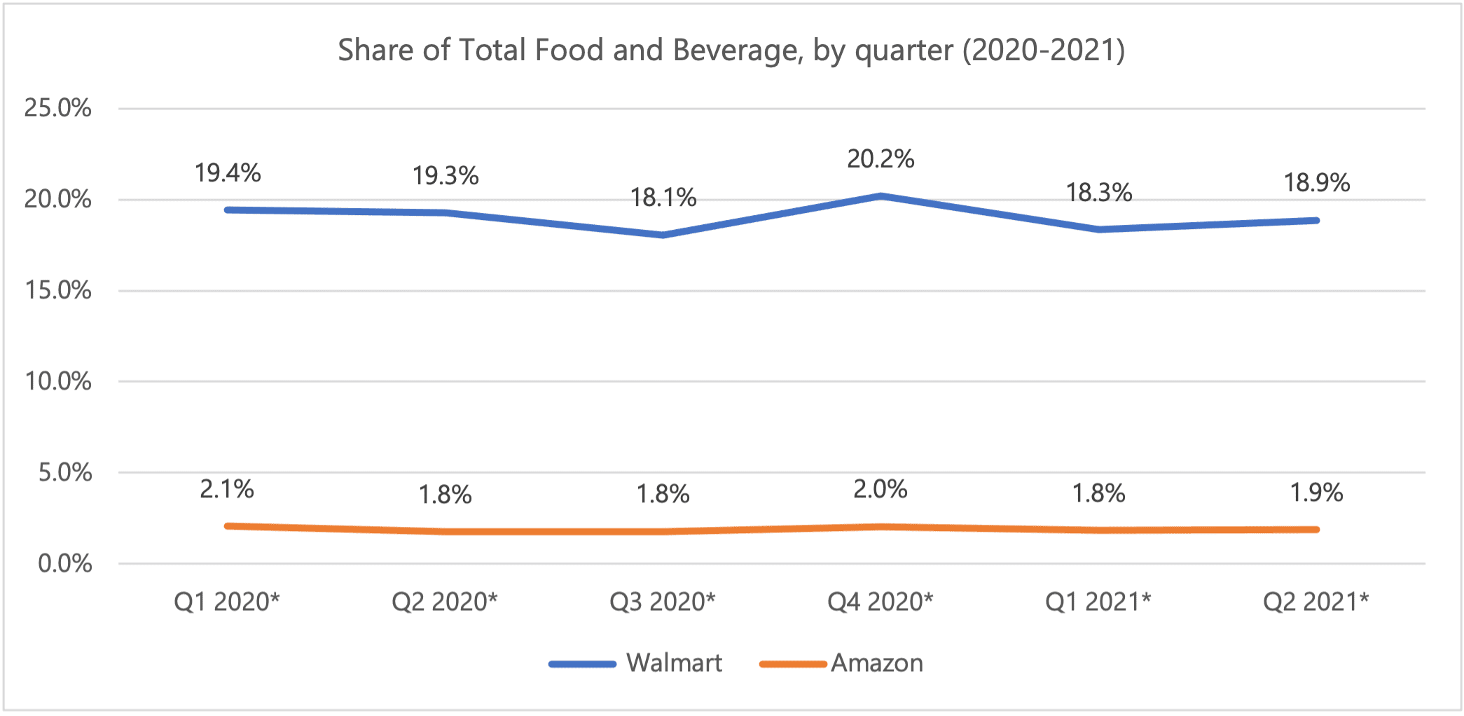 And looking just at digital grocery sales, Amazon appears to have a growing advantage. In the second quarter of 2020, the company saw approximately 28% of eCommerce food and beverage purchases; in the same period this year, Amazon has a 33% share.