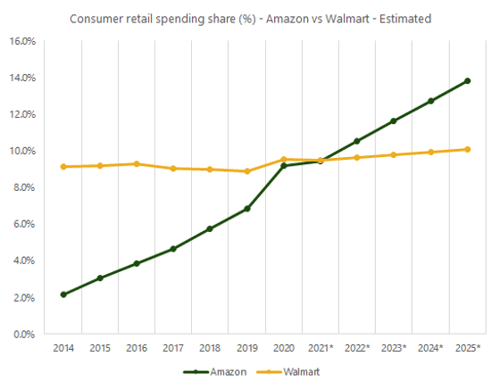 For its part, the yellow line shows that Walmart’s annual low single-digit sales growth during that same 10+-year period of time has allowed it to maintain its market share of U.S. retail sales, but it has hovered relatively consistently between 9 and 10 percent, where it is forecasted to remain.