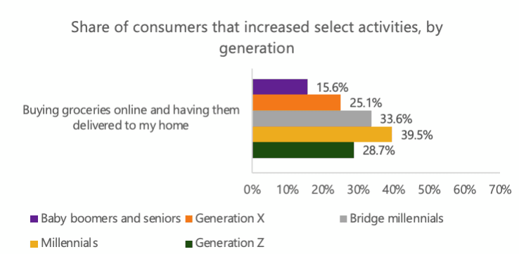 Even older consumers, however, have been trying out grocery delivery in far-from-negligible amounts. One in every six consumers above the age of 57 has turned to these services more than before the pandemic, as has one in every four Gen X-ers.