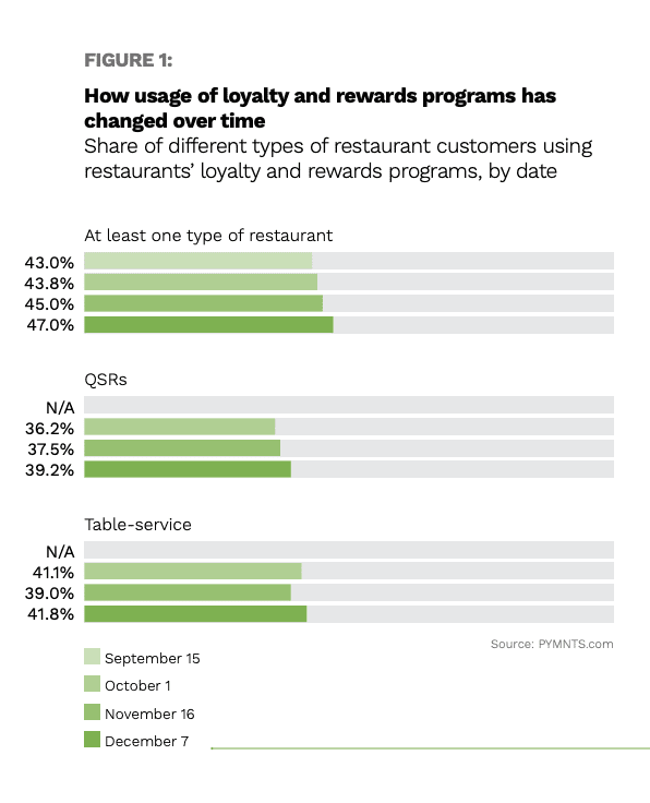 “Consumers are engaging with restaurants’ loyalty and rewards programs more often than they have since we began tracking their ordering habits. This is the third consecutive month in which PYMNTS has seen restaurant customers’ loyalty and rewards usage increase, with 47 percent of restaurant customers now saying they use their restaurants’ loyalty and rewards programs — up from 43 percent in September 2020,” per Delivering on Restaurant Rewards.