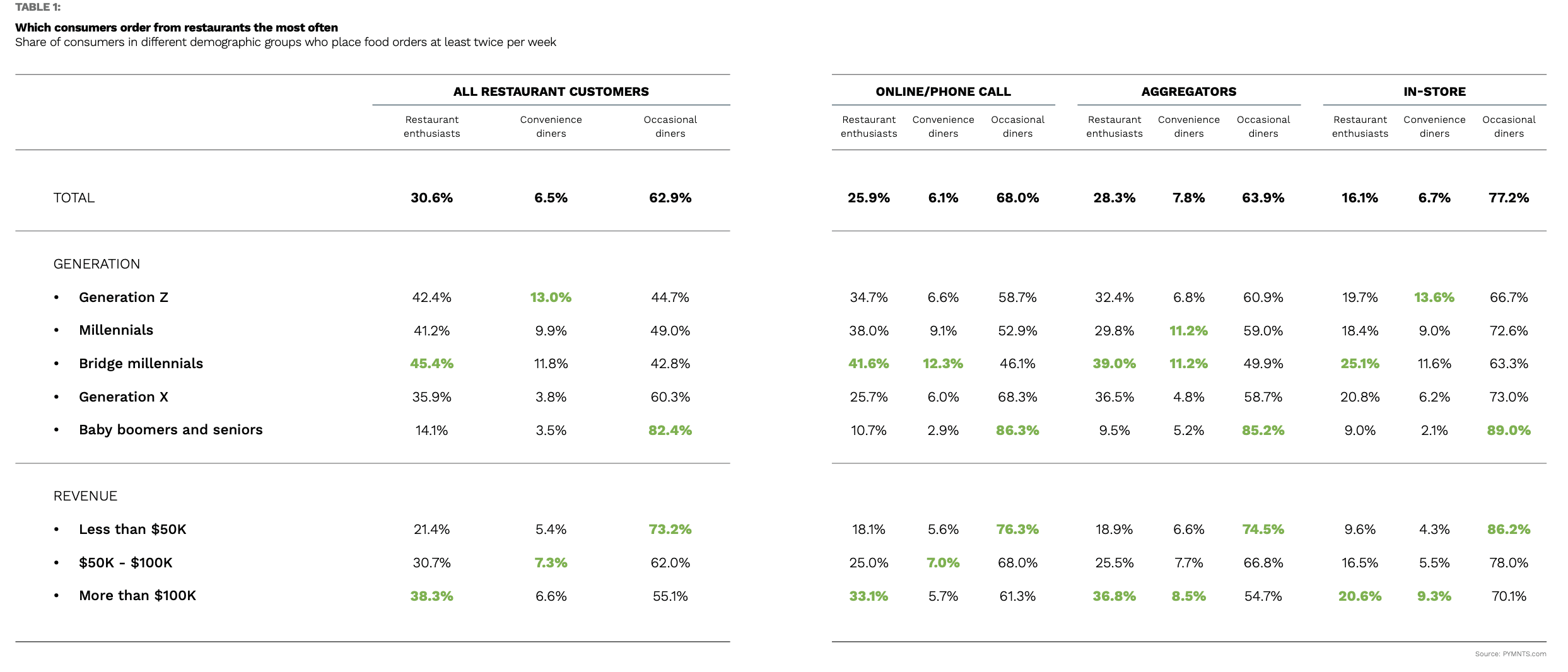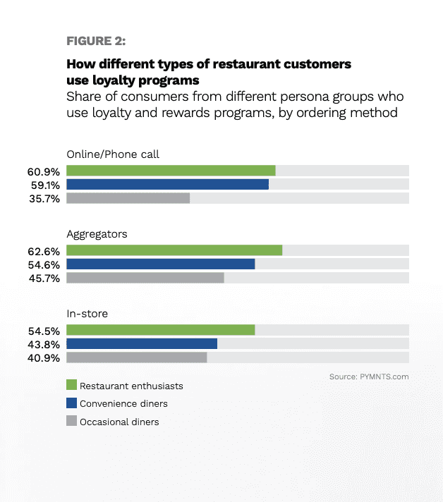 As a result, 61 percent of enthusiasts placing food orders online or via phone now report using loyalty programs, and 63 percent of enthusiasts ordering with aggregators said the same. That is appreciably more than the 55 percent of consumers who continue ordering in person.