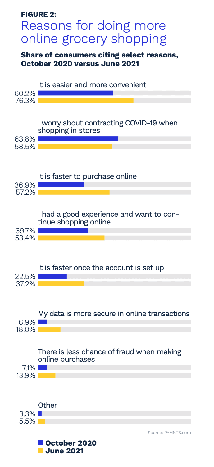 What Consumers Expect From Their Grocery Shopping Experiences provides answers, noting the “pandemic was a catalyst for the long-term adoption of new habits,” and adding, “More than three-quarters of those who increased their use of digital grocery shopping channels said they did so because digital channels provide an easier and more convenient way to shop. Avoiding COVID-19 was a less common motivation, cited by 59 percent of shoppers.”