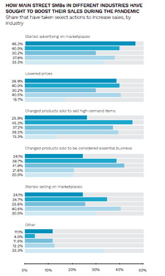 Those in the services industry, including construction and retail trade businesses, are among the most likely to use digital platforms to promote their businesses — 46 percent reported they’ve started advertising on digital marketplaces and aggregators since the pandemic began, and 24 percent have begun selling products on digital marketplaces and aggregators in that time. The data also demonstrated that 38 percent of Main Street survivors in retail trade began advertising on digital marketplaces and aggregators while 41 percent began selling on digital marketplaces and aggregators during the past year.
