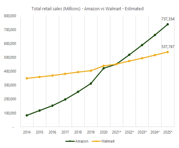 According to PYMNTS’ analysis and projection of total U.S. retail sales, Amazon is on track to outgrow Walmart by more than a three-to-one margin through 2025 by adding $315 billion in additional sales, or roughly 75 percent more than present levels.*