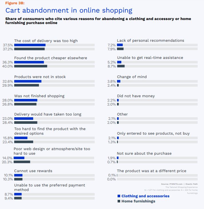 Among those who abandoned a clothing and accessory purchase online, 38% said they did so because the cost of delivery was too high and 36% said they did so because they found the product cheaper elsewhere.