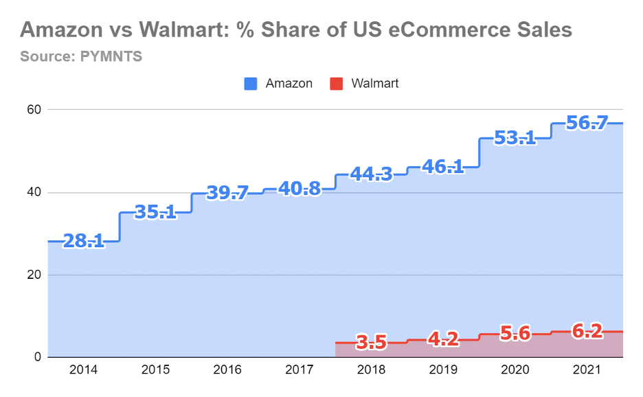 To be fair, PYMNTS uses a gross merchandise value calculation, which reflects the full dollar amount of items sold, rather than the fractional commission that Walmart or Amazon would book on third-party sales.