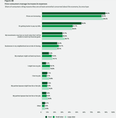 Price increases continue to weigh heavily on perceptions, with rural consumers reporting the greatest concerns (86%), followed by those in large urban areas (83.2%). Those living in smaller urban areas are the least worried but their percentage is still high (80.9%).
