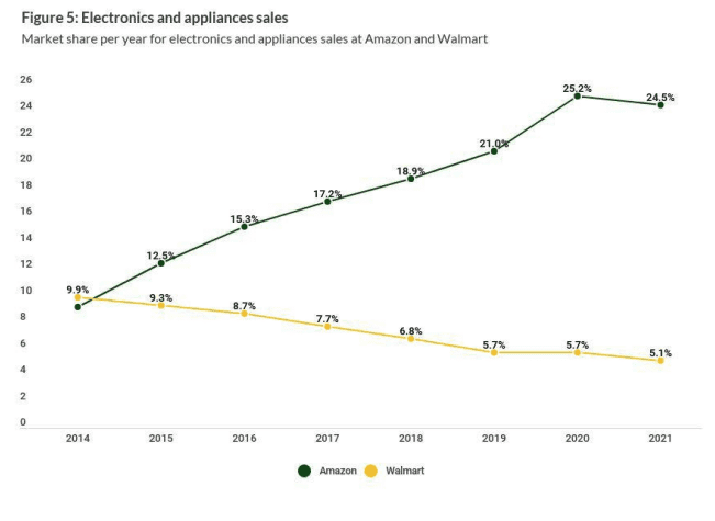 “Even during the early stages of the pandemic, Amazon’s control of the appliance and electronics market surged,” the report stated. “It rose from 21% in 2019 to 25% in 2020, while Walmart’s market share remained flat at 5.7%. Though both saw a dip in market share in 2021, Amazon’s market share was nearly five times that of Walmart’s.”